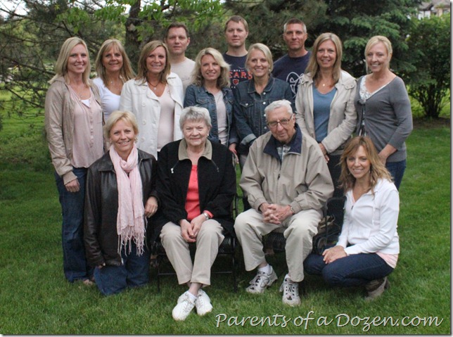 This past weekend my nephew got married and we had family in from several states. This is a picture of my parents and their 12 children. (I am the 5th oldest)